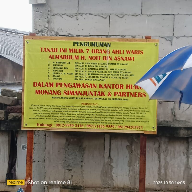 JAKARTA- 7 0rang Ahli waris Almarhum H Noit Asnawi melakukan somasi melalui surat peringatan melalui kuasa hukum Monang simanjuntak dan partners yang dilayangkan kepada Saudari Muni Asih terduga penyerobotan lahan di Jl. Bambu larangan No. 8 Rt. 05/09, Pegadungan, Kalideres Jakarta Barat.