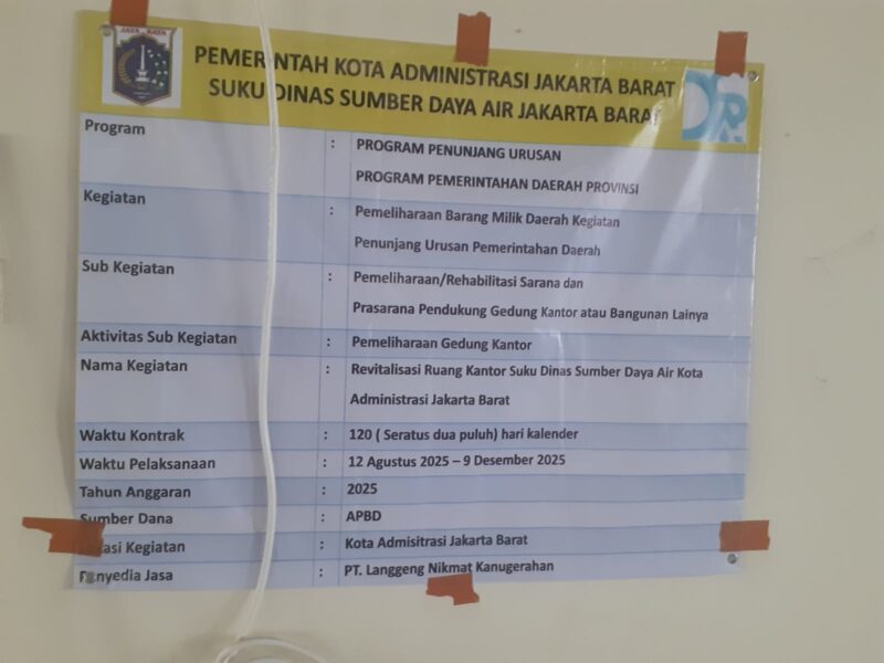 Namun tidak demikian halnya yang terjadi di sudin sumberdaya air jakarta barat,proyek rehabilitasi ruang kantor sudin jakarta barat yang berlokasi di kantor walikota gedung B lantai 8 jakarta barat,yang ditaksir nilainya miliaran rupiah,pada papan proyek tidak tercantum jumlah anggaran.